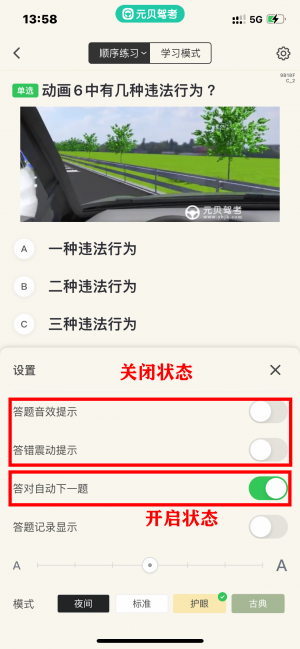 【元贝驾考功能介绍-刷题设置】如何关闭音效、震动以及自动切换下一题?